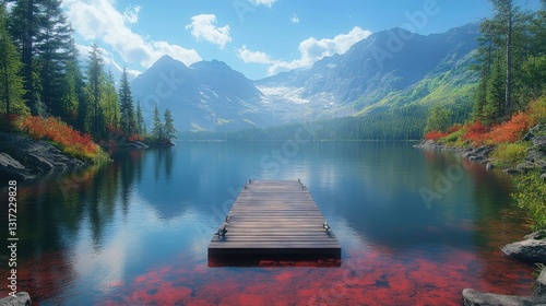 A serene landscape featuring a calm lake surrounded by majestic mountains.