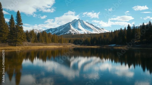 A serene landscape featuring a snow-capped mountain reflected in a calm lake, surrounded by lush evergreen trees and a bright blue sky.