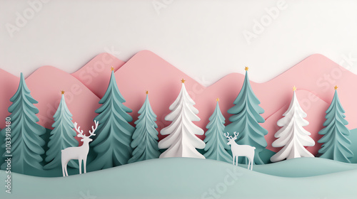 A serene landscape featuring cut-out trees and deer, set against pastel mountains. A whimsical representation of nature in a paper art style.
