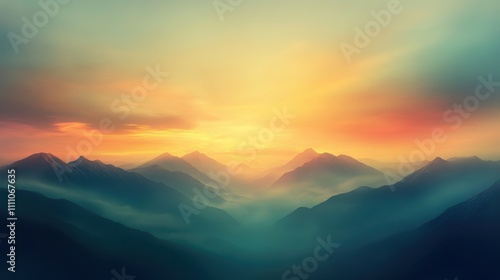 A serene landscape featuring misty mountains under a colorful sunrise, creating a tranquil and picturesque atmosphere.