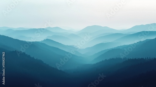 A serene landscape featuring rolling blue mountains layered in mist, creating a tranquil and atmospheric scene.