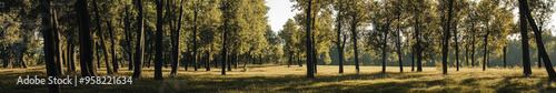 A serene landscape in an Asian region, featuring numerous tall, ancient trees with broad canopies spread across the scene. The trees are large and majestic, creating a sense of tranquility and natural