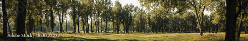 A serene landscape in an Asian region, featuring numerous tall, ancient trees with broad canopies spread across the scene. The trees are large and majestic, creating a sense of tranquility and natural