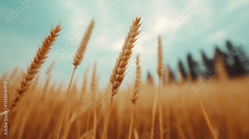 A serene landscape of golden wheat swaying gently in the breeze under a bright sky, evoking feelings of tranquility and connection with nature's bounty in the countryside.