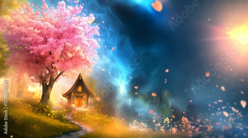 A serene landscape showcasing a charming cottage beneath a blooming cherry blossom tree, bathed in warm sunlight. The whimsical atmosphere invites tranquility and beauty.