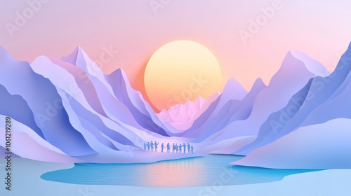A serene landscape with mountains, a lake, and silhouetted figures against a pastel sunset.