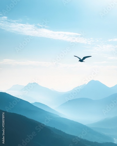 A serene landscape with mountains and a bird soaring through a blue sky.
