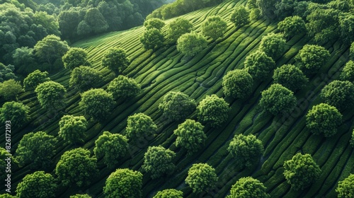 A serene landscape with neatly arranged rows of trees creating linear patterns.
