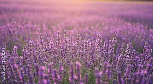 A serene lavender field bathed in the golden light of sunset, a tranquil and peaceful scene evoking calm and serenity with soft focus and warm tones.
