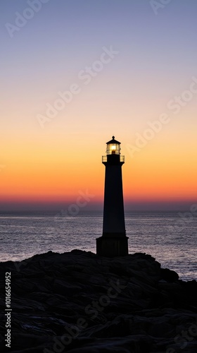 A serene lighthouse silhouette against a vibrant sunset, guiding ships safely with its light over tranquil waters.