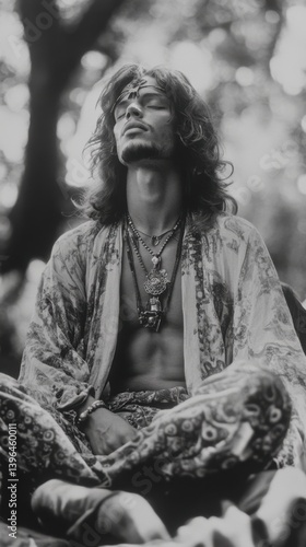 A serene, long-haired man meditates outdoors, adorned with necklaces and patterned clothing, radiating peacefulness in a vintage black and white style