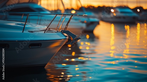 A serene marina scene at sunset with boats reflecting on the water.