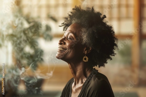 A serene, mature black woman meditates with a radiant smile, surrounded by soft, warm light. The gentle scent of incense fills the air, creating a peaceful atmosphere