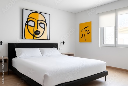 A serene minimalist apartment bedroom, with neutral tones, crisp linens, and a single abstract painting on the wall