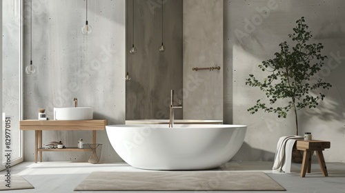 A serene minimalist bathroom with a white freestanding bathtub, wooden accents, and a large mirror reflecting the clean design.