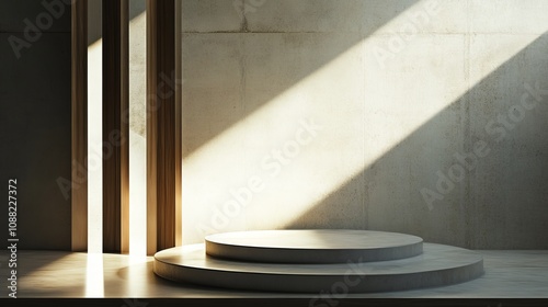 A serene, minimalist interior featuring a circular platform with soft lighting casting shadows on concrete walls.