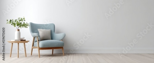 A serene minimalist interior featuring a light blue armchair The chair is positioned next to a small wooden side table which holds a vase with green foliage and other small items The backdrop