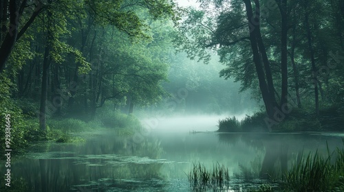 A serene, misty forest landscape with a calm water body reflecting lush greenery.