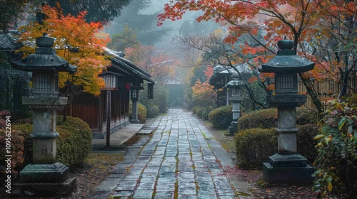 A serene, misty pathway lined with lanterns and vibrant autumn foliage.
