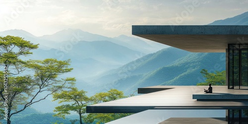 A serene modern architecture overlooking misty mountains, promoting relaxation and contemplation.