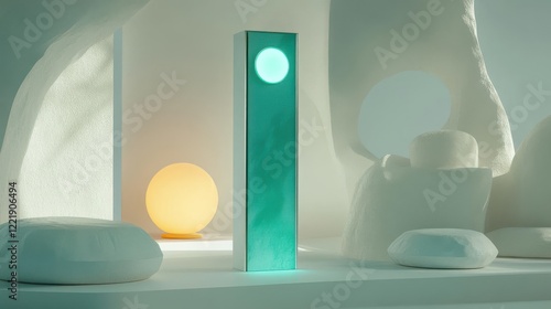 A serene, modern interior featuring a glowing orb and a tall, illuminated structure.