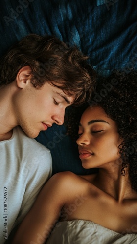 A serene moment of a couple resting together, exuding warmth and intimacy on soft bedding. Ideal for relaxation themes.