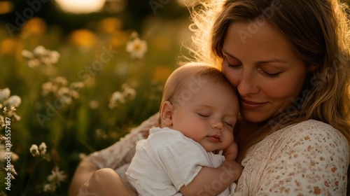 A serene moment of a mother holding her sleeping baby in a flower-filled field.