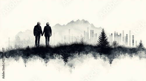 A serene moment of an elderly couple holding hands against a misty mountain backdrop