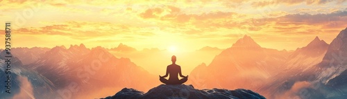 A serene moment of meditation at sunrise, surrounded by majestic mountains and a breathtaking sky.
