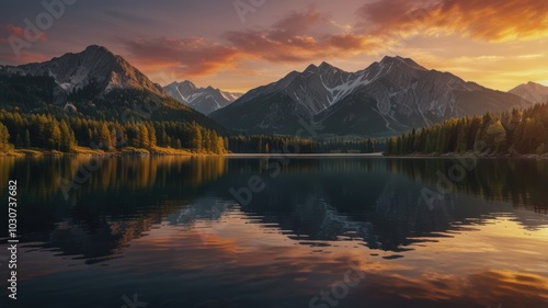 A serene mountain lake with a vibrant sunset sky and its reflection in the water.