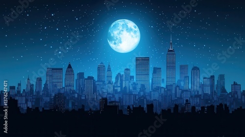A serene night cityscape with a glowing full moon illuminating the skyline, featuring tall buildings and a starry sky.