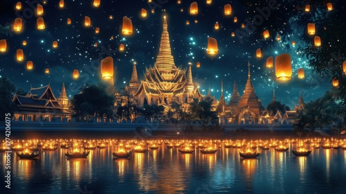 A serene night scene featuring a stunning temple illuminated by floating lanterns and shimmering reflections on water.