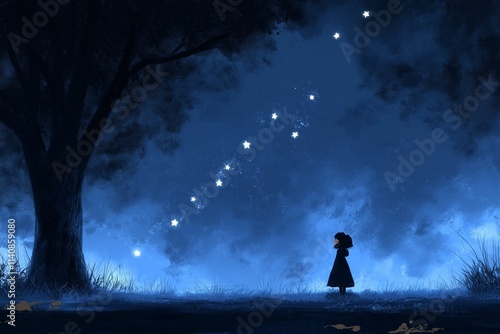 A serene night scene with a girl gazing at stars under a tree. This Feminism illustration embodies the spirit of empowerment, perfect for International Women's Day celebrations.