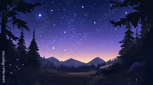 A serene night sky filled with stars above a peaceful mountainous landscape.