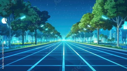 A serene nighttime city street lined with trees, shining lights, and a clear sky
