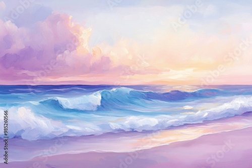 A serene ocean scene featuring gentle waves under a colorful sky at sunset, evoking tranquility and natural beauty.