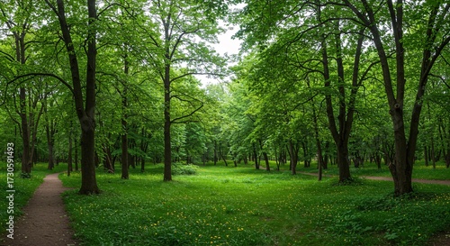 A serene panoramic landscape of a lush green forest park with a tranquil path winding through tall deciduous trees and a vibrant grassy meadow