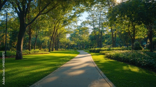 A serene park with walking paths and lush greenery, designed to provide a calming backdrop with space for copy.