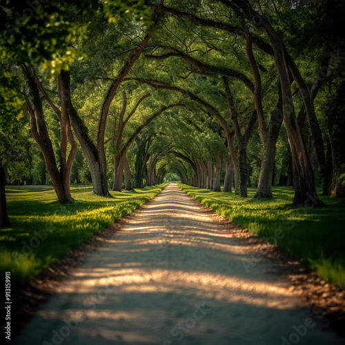 A serene path bordered by lush trees and green grass, inviting a peaceful stroll through nature.