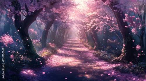 A serene pathway lined with cherry blossom trees, creating a tranquil and picturesque scene.