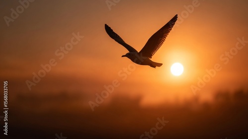 A serene photo of a bird flying close to a sunset or sunrise, with warm, golden hues highlighting the silhouette of the bird and creating a peaceful atmosphere.