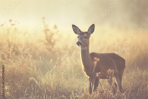 A serene picture of a fallow deer doe and her fawn in a sun-dappled forest clearing