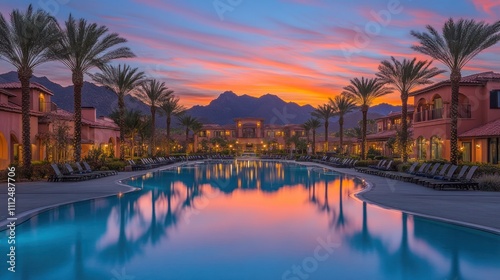 A serene poolside view at sunset with palm trees and mountains in the background.