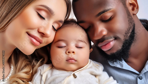A serene portrait of parents with their happy, peaceful, and calm baby