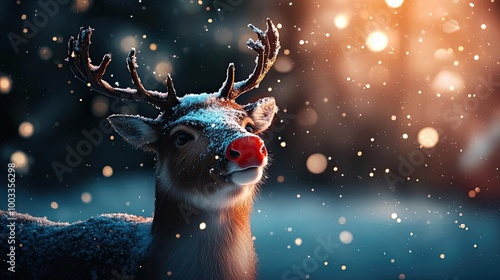 A serene reindeer in a snowy landscape, illuminated by soft glowing lights, capturing the essence of winter's beauty.