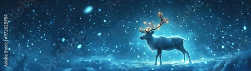 A serene reindeer stands in a snowy landscape, illuminated by soft lights against a magical winter atmosphere.