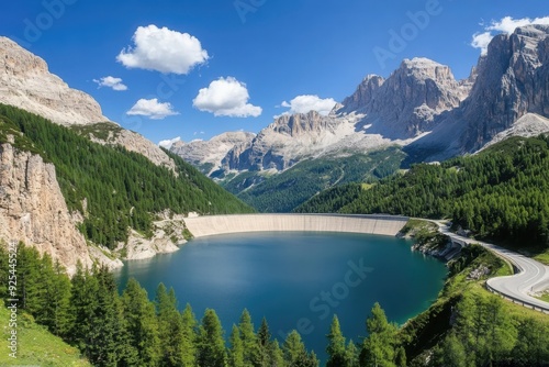 A serene reservoir surrounded by lush greenery and rugged mountains under a clear blue sky.