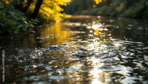 A serene river reflects the forest in a shimmering display, sunlight dancing on the surface creating fragmented patterns