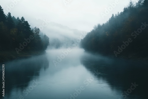 A serene river shrouded in morning mist, surrounded by lush forests and tranquil hills