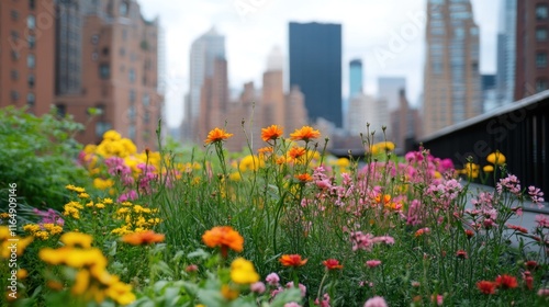 A serene rooftop garden with blooming flowers and city skyline views